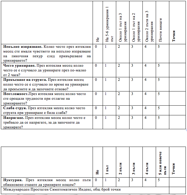 Този въпросник се попълва самостоятелно от пациента и дава количествена оценка на симптомите причинени от доброкачествената простатна хиперплазия. Всеки пациент с увеличена простатата има затруднено уриниране, слаба струя, често уриниране и други симптоми, но за нас е важно да знаем в каква степен е затруднено уринирането, колко е слаба струята и така успяваме да се ориентираме по-лесно в тежестта на заболяването.